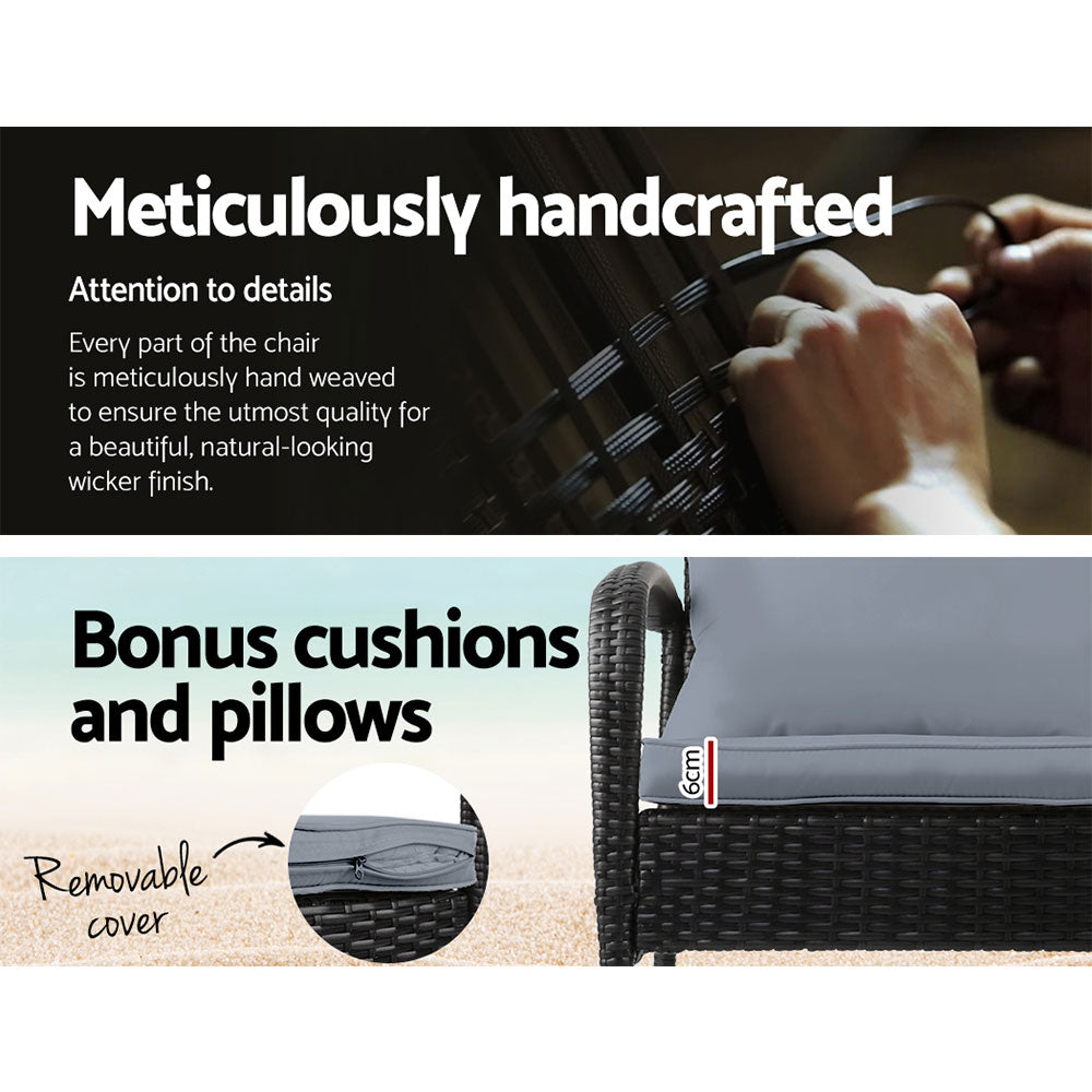 Gently sway to the better moments of life with the Outdoor Rocking Set. Our high-quality resin rattan chair and tempered glass wicker side table is made weather-resistant and UV-resistant to stand up to the test of time and climate with their powder-coated steel frame and meticulous workmanship. Better still, the set comes with matching thick cushions and pillows with removable covers to let you rock your leisure time away with utmost comfort. Not least, the table also features a wicker border finish with a tempered glass top for safety and durability. So ease your mind, body and soul with the Outdoor Rocking Set. Perfect for both outdoors and indoors use.