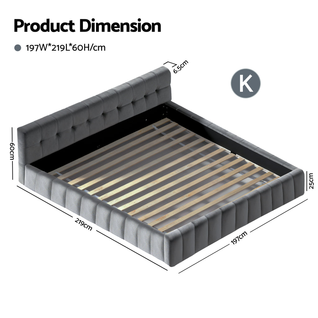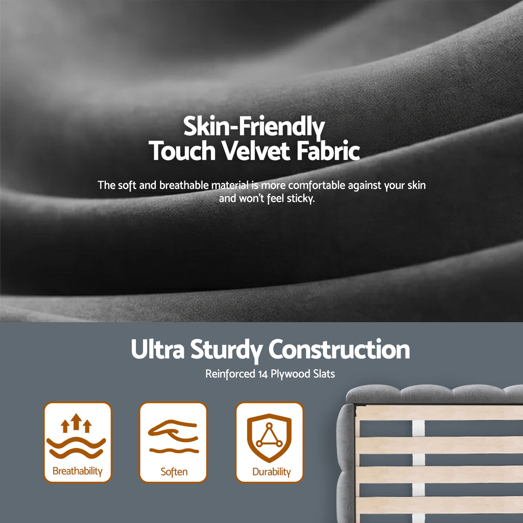 The King Bed Frame combines elegance and function with its cloud-inspired plush velvet headboard and modern platform base. Featuring a reinforced plywood-pine frame with 14 support slats and durable metal fixings, it holds 300kg and fits king mattresses (183x203cm). The smooth-edge velvet upholstery adds luxury while ensuring safety. Quick assembly completes this bedroom upgrade.