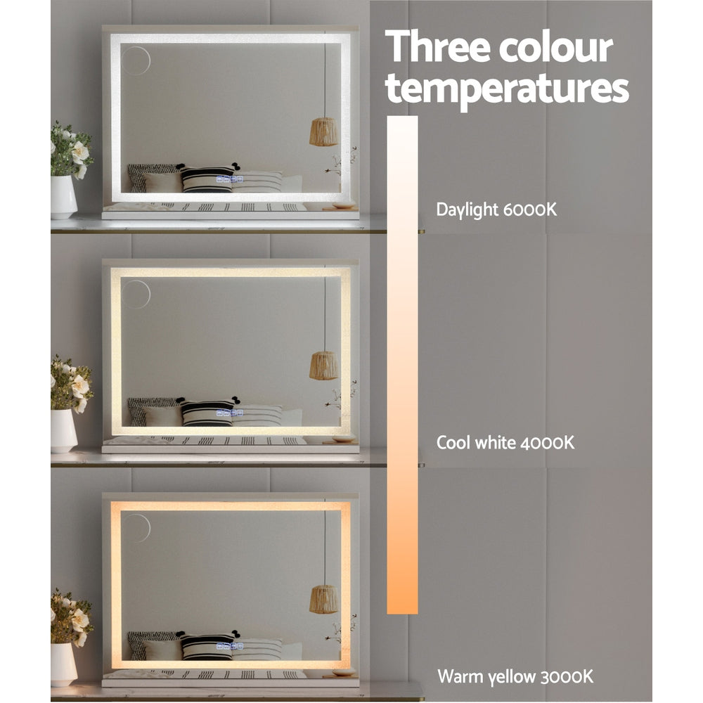 Get the star treatment you deserve with a gorgeous lighted Makeup Mirror from . Framed by LED light strips, the mirror lights up your visage to accurately complete your makeup routine. The frame is sturdy and lightweight, adding a touch of glamour to the entire mirror. The frame sits on an equally smooth powder-coated MDF base for stability and durability. The base is detachable, so you can choose to wall mount your mirror and save space. The light is easily adjustable using the mirror touch controls. Adjust for brightness and colour temperature including warm light, natural light and cool light. A built-in Bluetooth speaker allows you to listen to your favourite audiobooks, music and podcasts as you go, and the USB charging port can help keep your devices charged at all times. Turn your bedroom into a celebrity dressing room overnight with the Makeup Mirror.