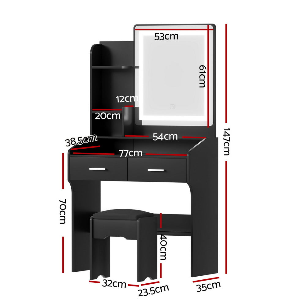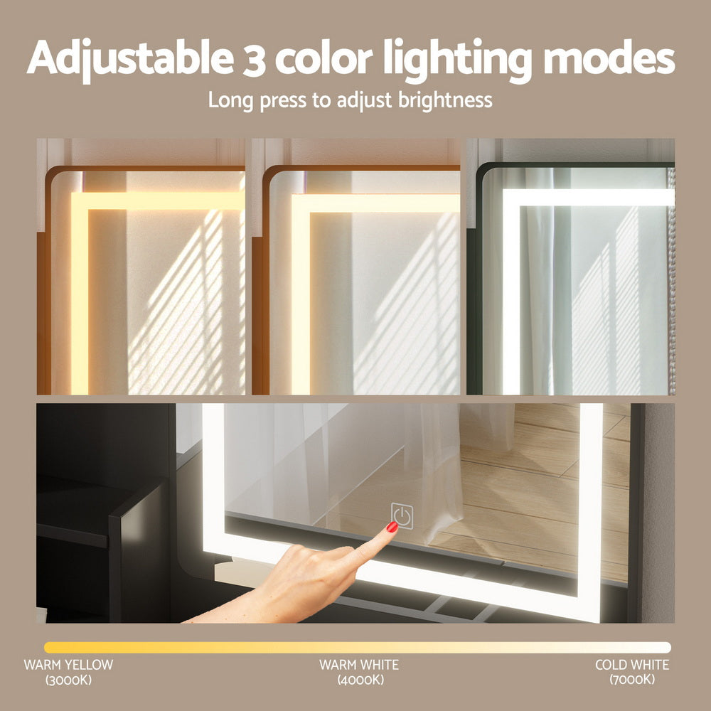 Upgrade your beauty routine with the LED Dressing Table. Featuring a Hollywood-style makeup mirror with an LED stripe, this vanity offers three adjustable light modes—warm, cool, and natural—for perfect lighting every time. The two spacious drawers ensure your beauty essentials stay neatly organised, while the anti-drop panel provides added safety and stability. The foam-padded stool adds comfort for extended use, and the sleek, easy-to-clean design ensures low maintenance. Ideal for bedrooms or professional settings, this modern vanity is the perfect blend of functionality and style.