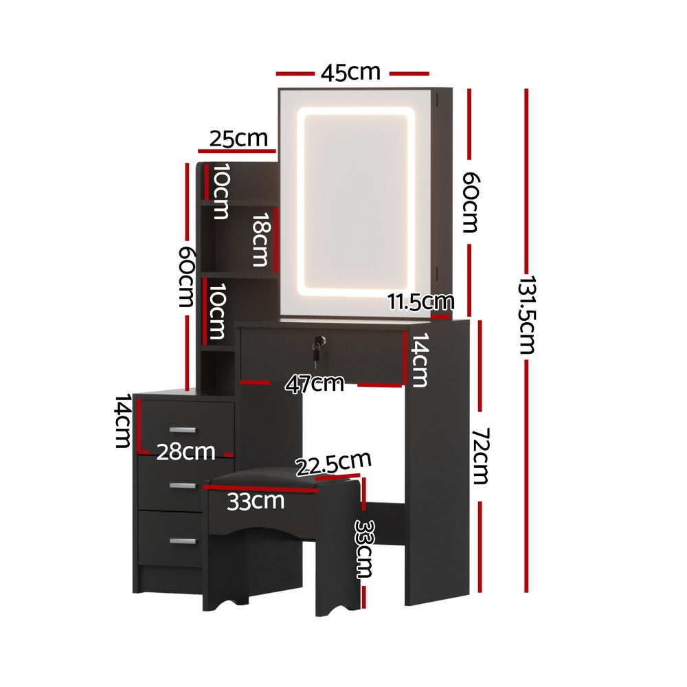 The LED Dressing Table is the ultimate blend of style and functionality. Featuring a sliding mirror door with hidden storage and 3 adjustable LED lighting options, this vanity table ensures perfect lighting for makeup application. Its 4 spacious drawers, including a lockable one, offer ample space to keep your beauty essentials organised. The foam-padded stool adds comfort, while the durable, easy-to-clean design ensures longevity. Ideal for bedrooms, apartments, or professional use, this modern vanity is a must-have for beauty enthusiasts.
