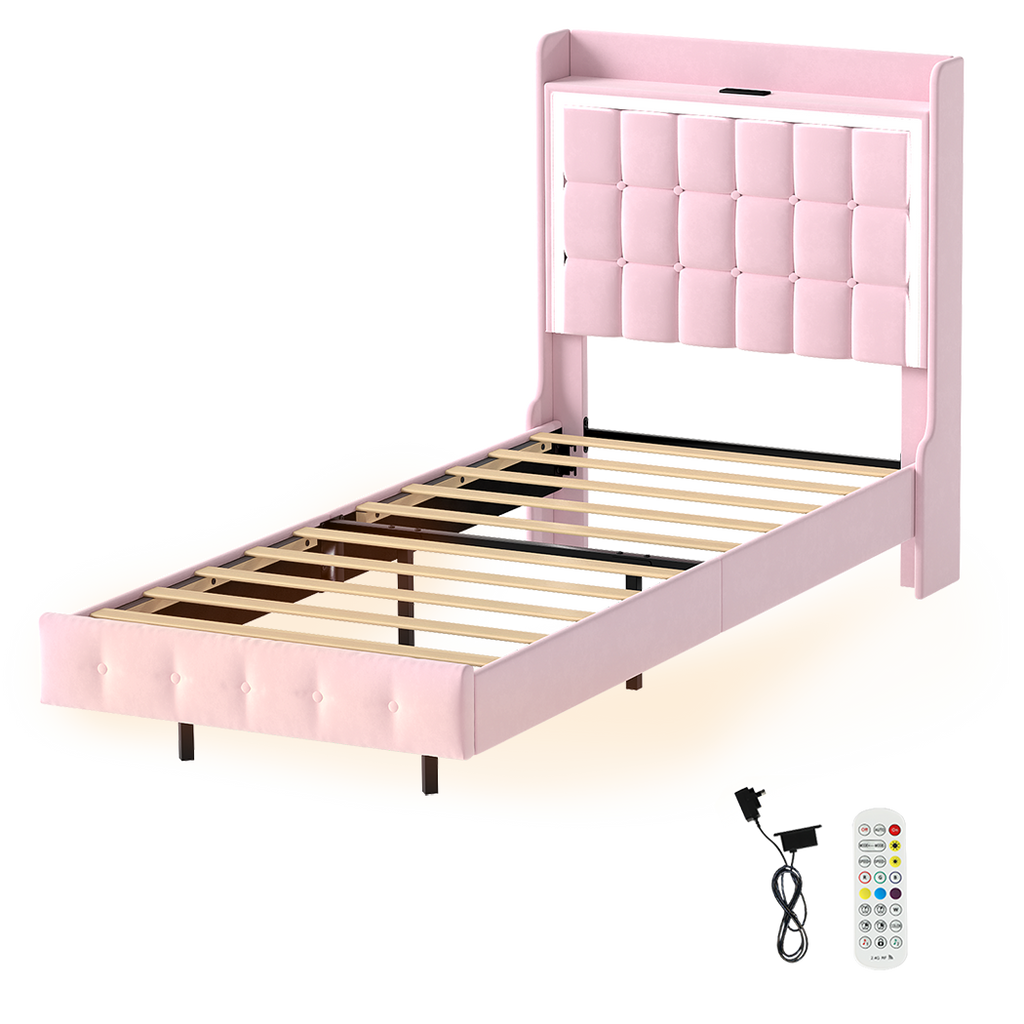 LED light strips in the headboard and footboard with remote-controlled brightness, plus music beat sync.