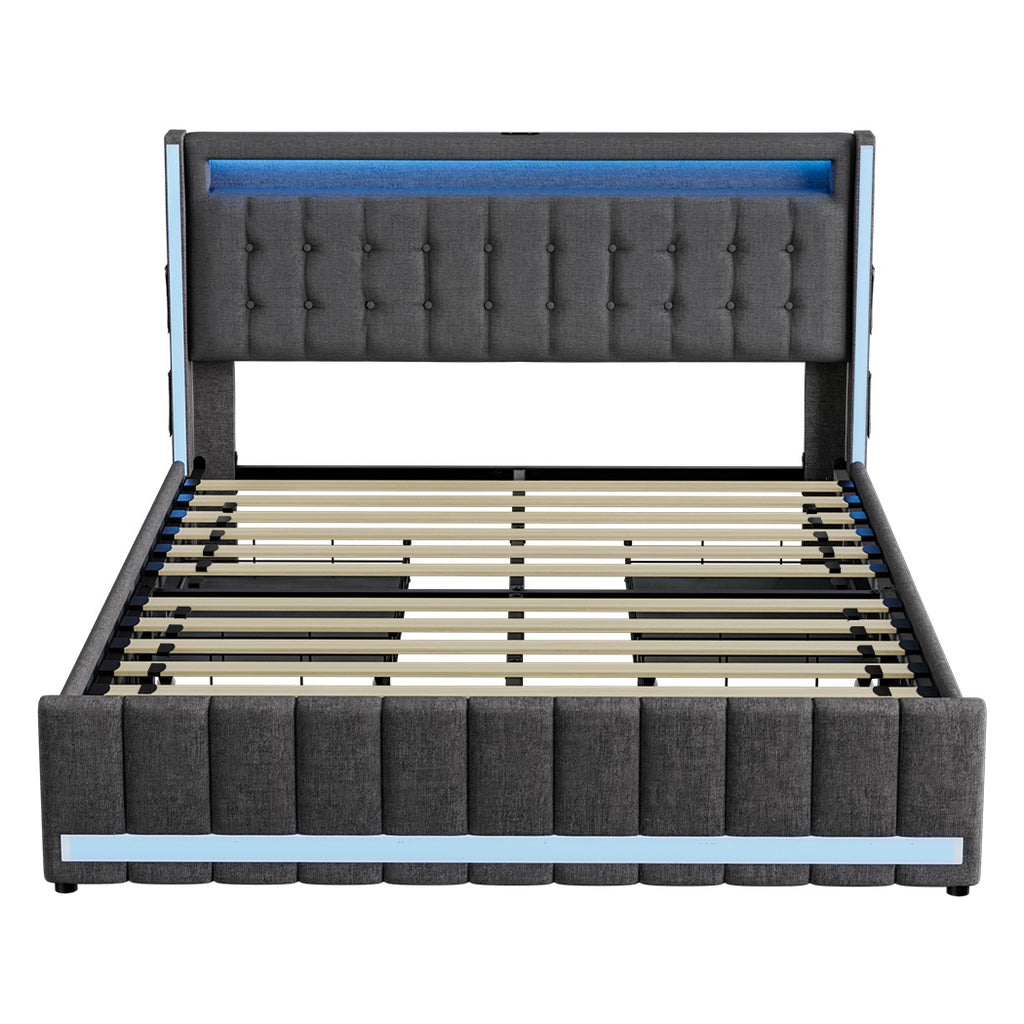 Stay powered up with built-in USB ports and power outlets, keeping your devices charged and your space clutter-free. Ambient RGB LED lighting wraps the headboard and base, offering a cosy glow with adjustable colours to match your mood.