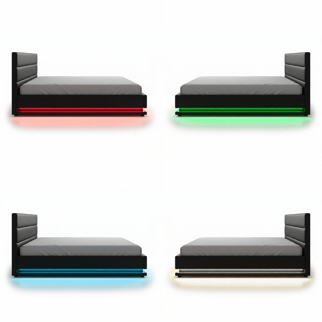 The Henley Gas Lift LED Storage Bed Frame brings together modern style, hidden storage and customisable lighting to create a practical yet stylish centrepiece for your bedroom. Upholstered in smooth black PVC leather with a plush padded headboard, this queen-size bed frame is designed to deliver comfort, organisation and a relaxing bedroom atmosphere.