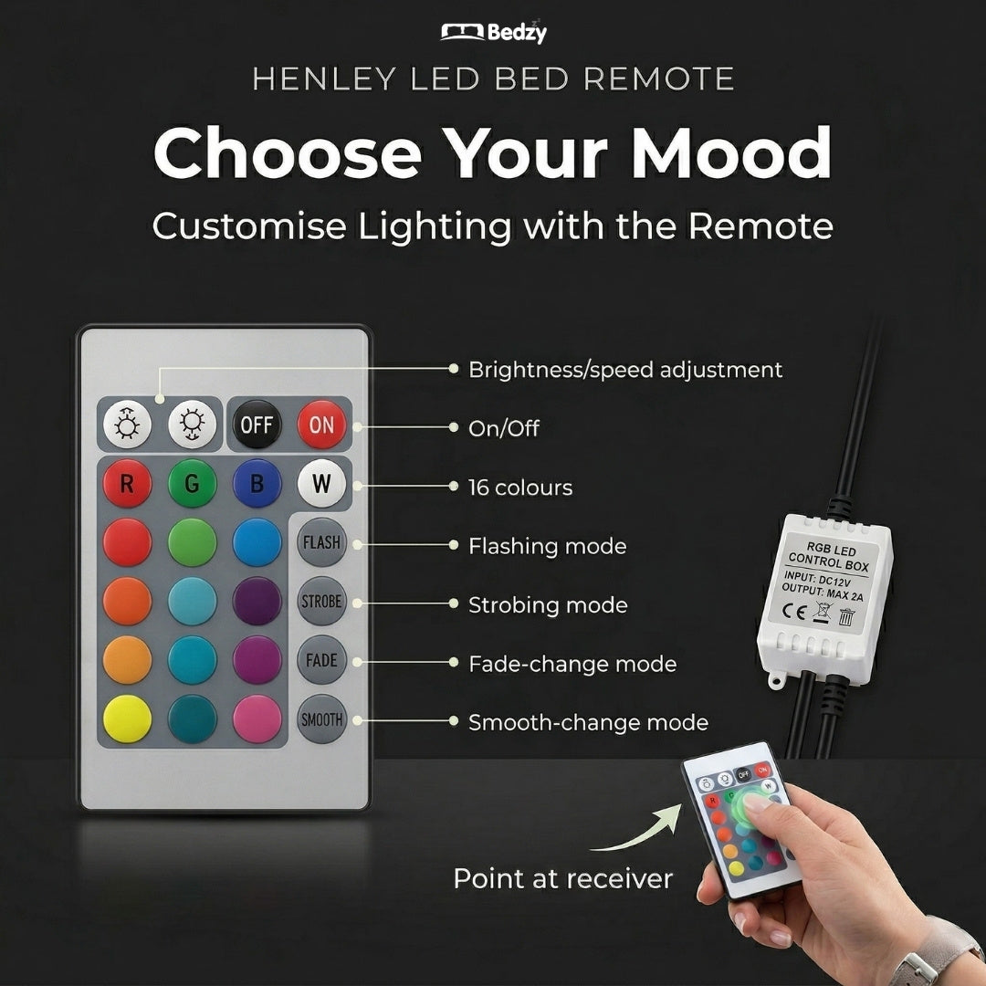 • Customisable LED Lighting: Choose from 16 colours and multiple lighting modes to create the perfect bedroom ambience.