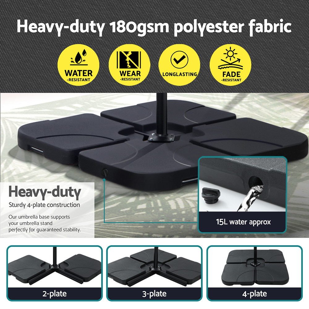 Introducing our Instahut Outdoor Umbrella with UV50+ polyester canopy, resistant to water and wear, and built with a sturdy steel frame for durability. This umbrella also features solar-powered LED lights with 32 LEDs on the ribs, alongside an easy open/close system and user-friendly crank for effortless operation.
