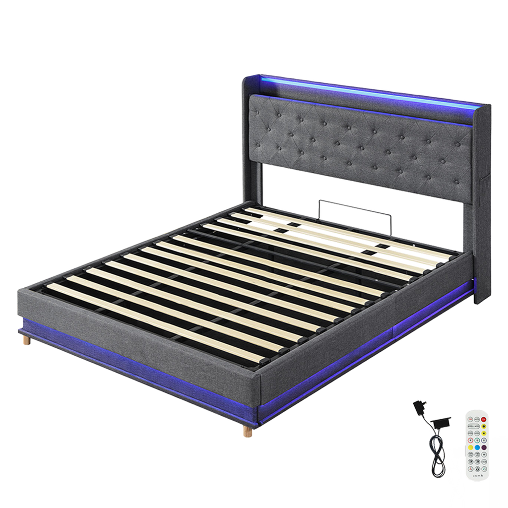 Upholstered in grey linen for a soft, contemporary feel, the hero feature is the tall headboard with an aluminium groove housing RGB LED strip lighting. Set the mood at night with customisable light colours, perfect for winding down after a long day.