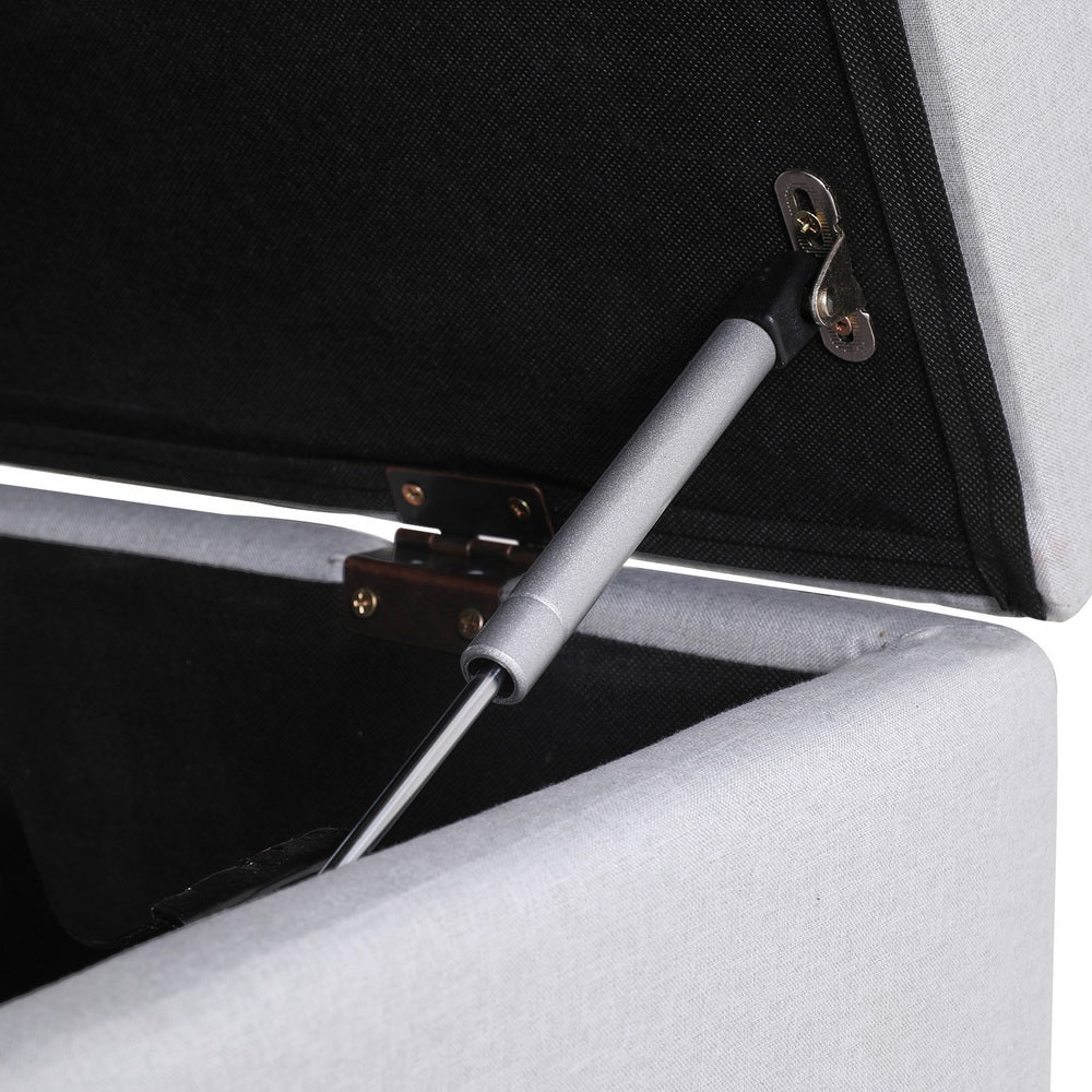 The storage ottoman bed with linen upholstery serves a dual purpose by providing ample storage while doubling as a bed. The hidden folding bed is a convenient space-saving feature for guests who wish to spend the night. The bed's sturdy plywood frame construction ensures stability and durability. The high-resilience foam padding enhances comfort, making it an ideal option for sitting or sleeping. The metal hinges offer smooth and straightforward operation, while the plastic feet protect the floor from scratches. This multi-functional piece can be used as a storage ottoman, coffee table, and sofa bed, making it perfect for small spaces. The storage ottoman bed is easy to assemble, making it a hassle-free addition to any room in your home.