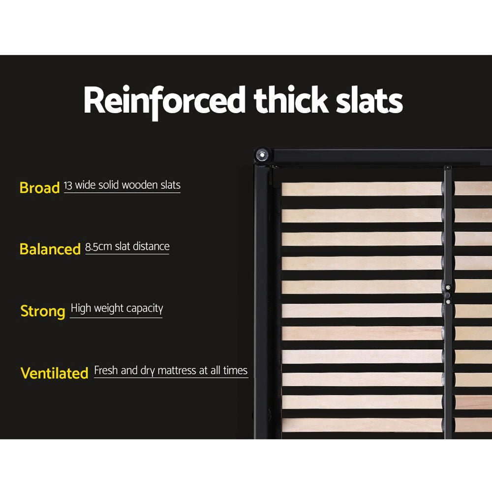 This remarkable piece of furniture features a wooden arched slat base that helps to distribute weight evenly across the frame, and a centre support strut to provide added stability to the overall structure.