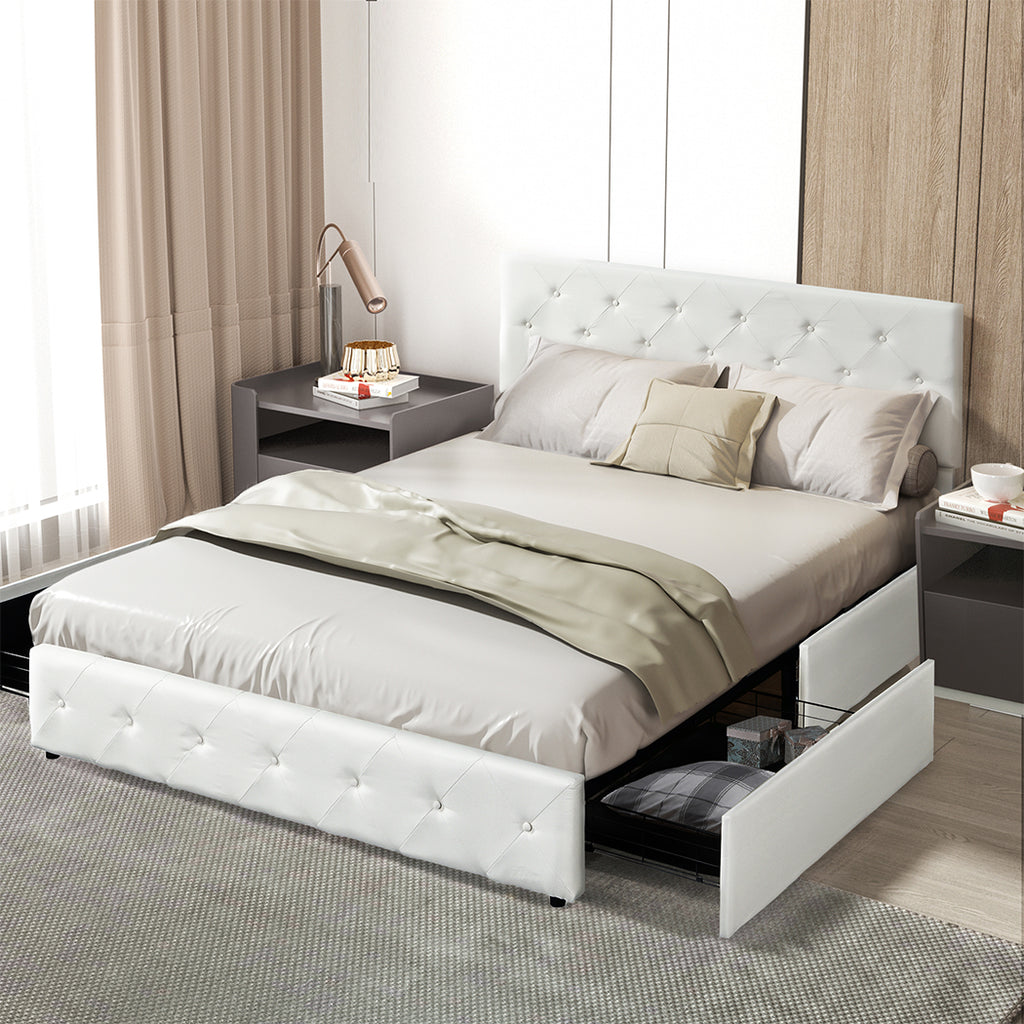 Style meets smart living with The Sorrento — a softly upholstered bed frame that doesn’t compromise on practicality. Wrapped in creamy white faux leather with a beautifully tufted backrest, this frame features four castor-mounted storage drawers, reinforced plywood slats, and noise-reducing EVA foam for silent support.