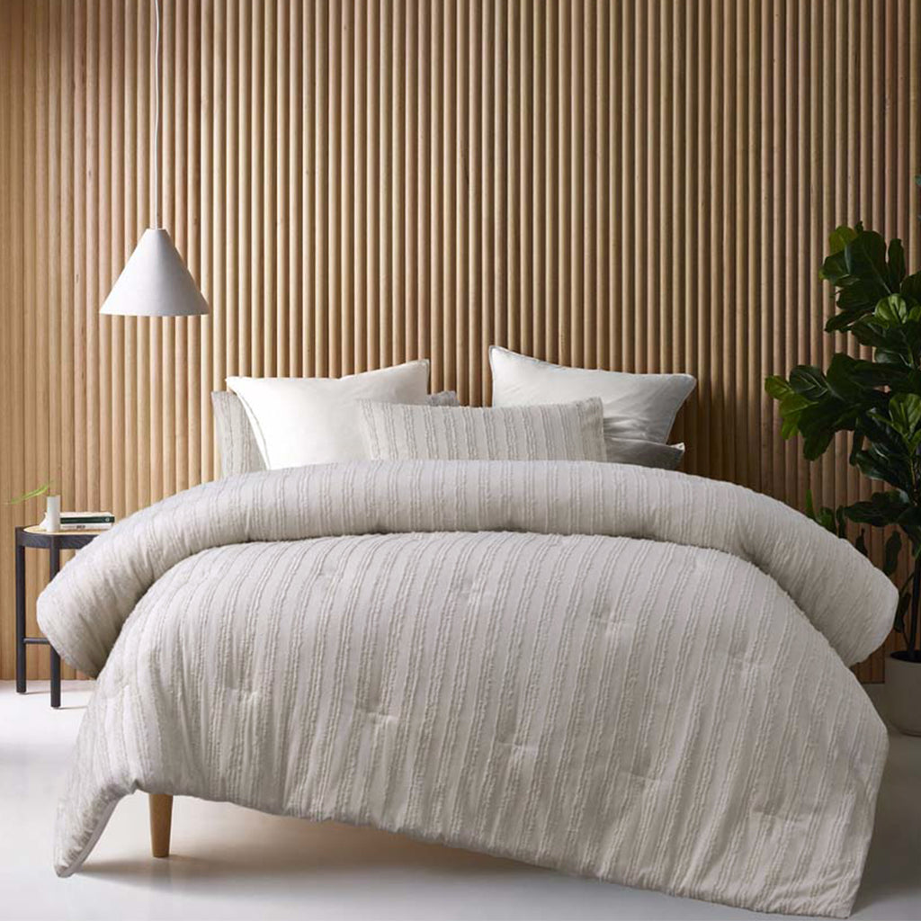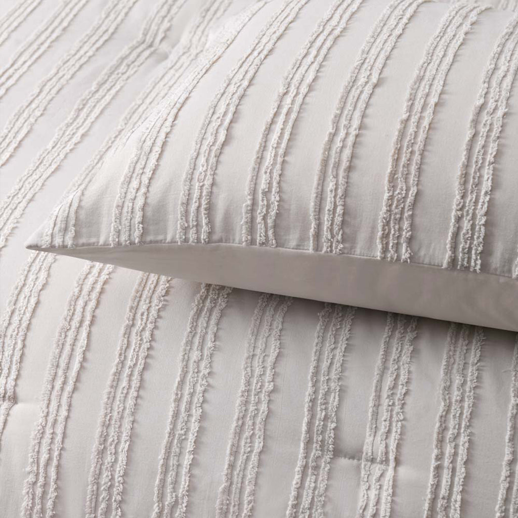 Change the look of your bedroom by adding some texture with the Reflections Natural 3 Piece Comforter Set by Vintage Design Homewares. This comforter set is made from 100% cotton cover with 100% Polyester filling, keeping you comfortable all night long. Our design features chenille stripes running down the comforter and pillowcases with quilted horizontal stripes adding that chic, minimalist style.